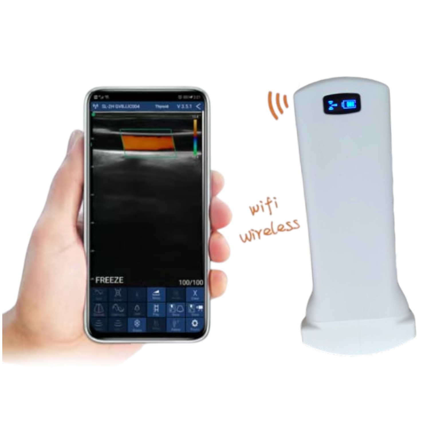 Alat Pemindai Ultrasonik Tipe Probe Nirkabel adalah pemindai ultrasonik generasi baru yang berupa probe wireless, dapat dihubungkan dengan perangkat seluler atau tablet (ponsel/iPad) untuk menampilkan gambar hasil pemindaian. Digunakan untuk visualisasi struktur internal tubuh secara non-invasif melalui gelombang suara frekuensi tinggi.